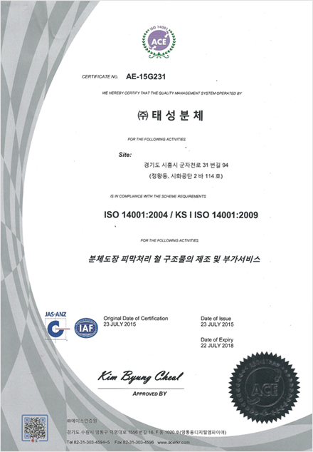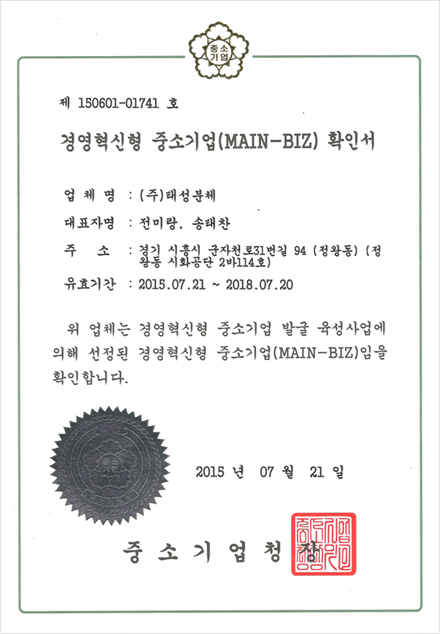 저희 태성분체의 기술력으로 인정받은다양한 종류의 인증서를 확인 하실 수 있습니다.