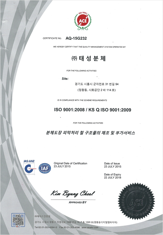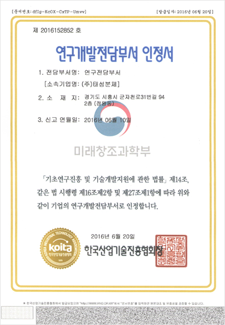 저희 태성분체의 기술력으로 인정받은다양한 종류의 인증서를 확인 하실 수 있습니다.